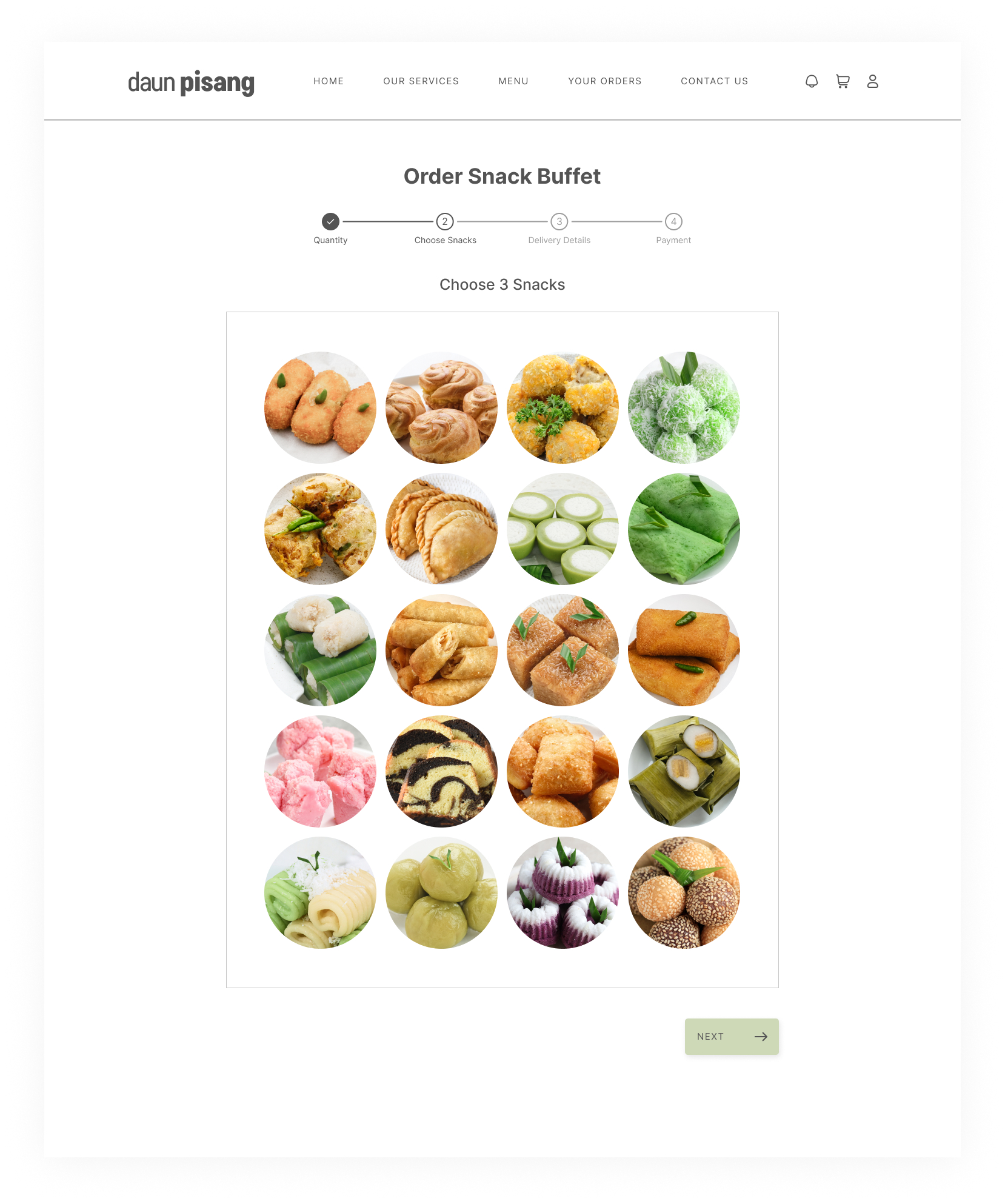 The second step is choosing the types of snacks users need. Displaying the snack thumbnails in round shapes is giving a bit of 'playful' mood, making this step seems like an amusing experience. Users are required to choose snacks as many as they requested in the first step.