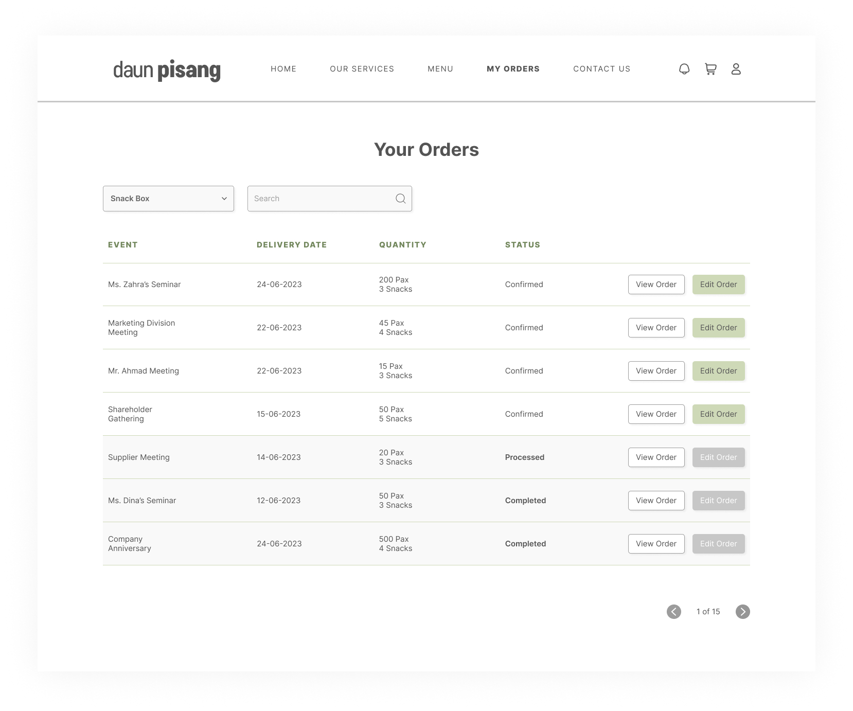 There are already many bakery and catering business offering these snack box service, but majority of them still require manual ordering system through chat message or phone calls. For big companies or government institutions that throw lots of meetings on weekly basis, it can be frustrating to arrange orders, let alone tracking and changing one.