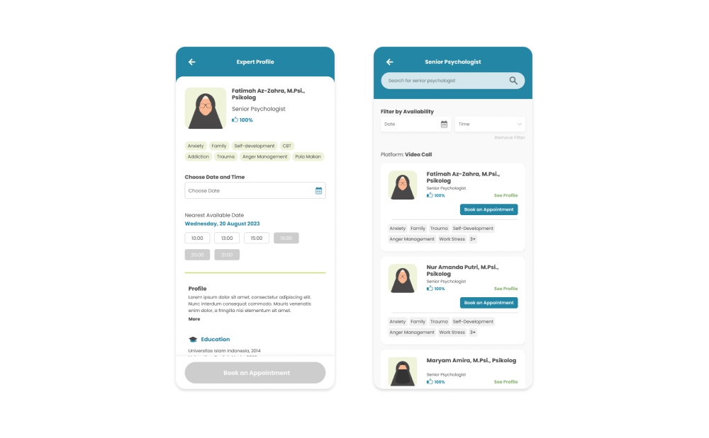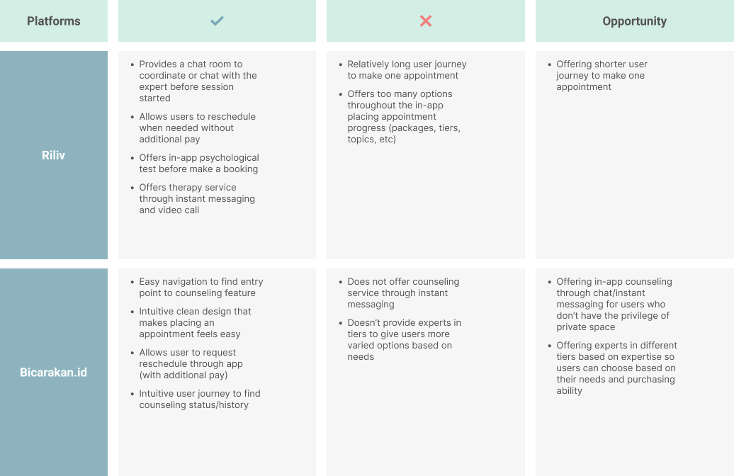 I conducted benchmarking on Riliv and Bicarakan.id, two leading similar mental health platforms from Indonesia. Both apps are providing online counseling service as well, with in-app appointment feature and with third party video call platform for the counseling session itself.