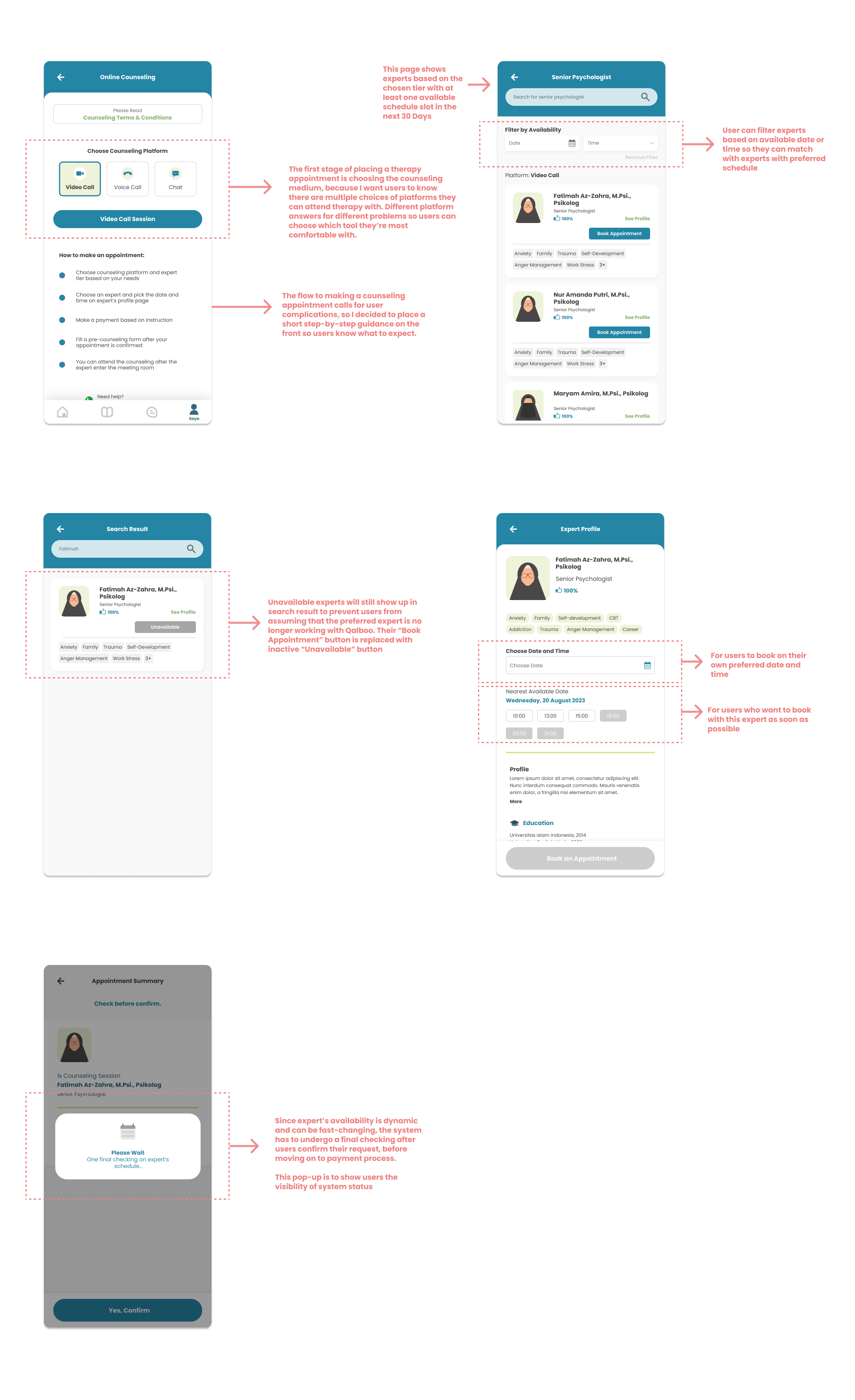 Making an appointment online can be agitating, so as a designer I have to dig deeper on how to provide a smooth, intuitive journey for users who is seeking help and hope. The idea of attending therapy session and talking about traumatic experience itself is frightening, that's why it is important to give a relatively painless experience in navigating this feature from the start to finish.